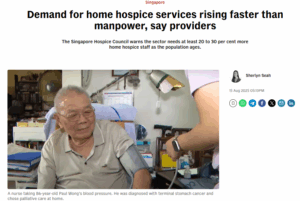 CNA featured a segment on home hospice care. HCA Medical Director Dr Chong Poh Heng shared insights, as well as how HCA honours patients’ last wish of dying at home despite growing demands and challenges, by empowering caregivers to care for loved ones and providing equipment rental.